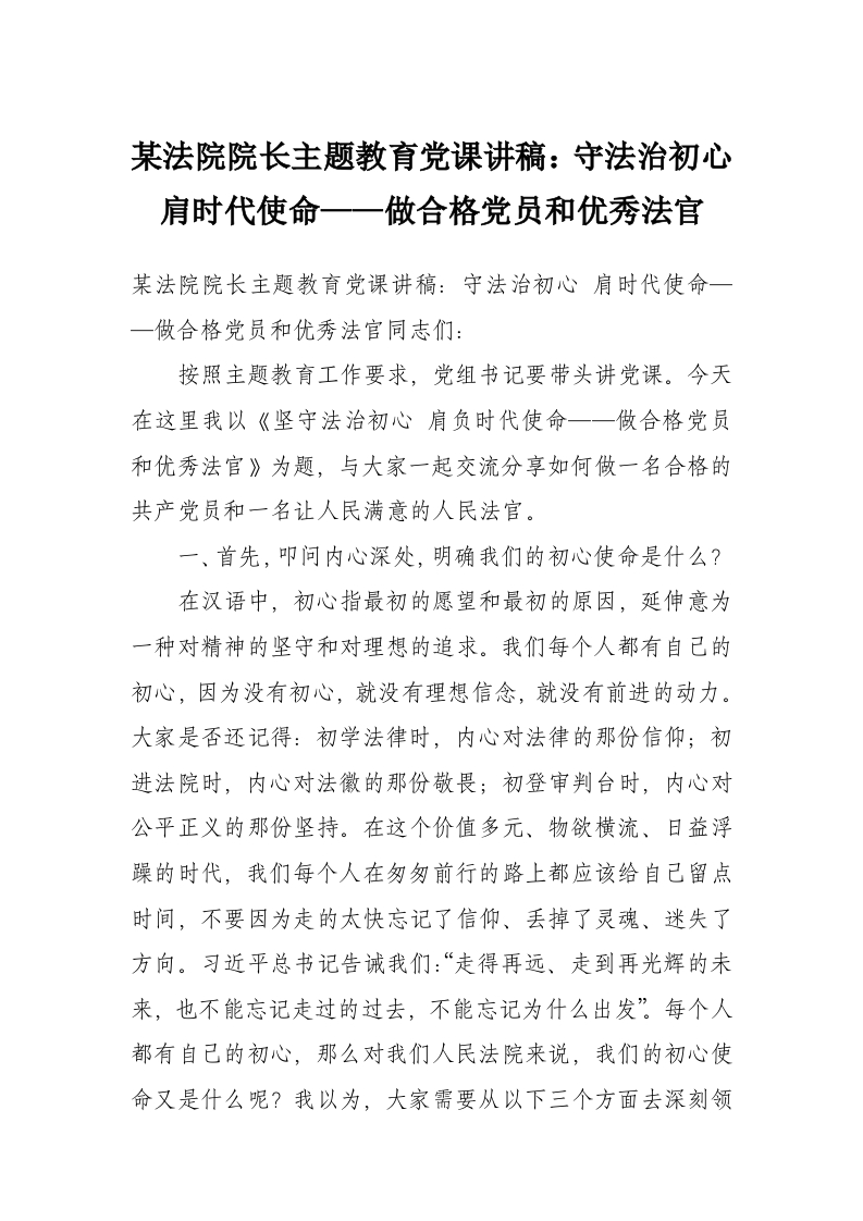 首页写作素材某法院院长主题教育党课讲稿:守法治初心 肩时代使命——做合格党员和优秀法官