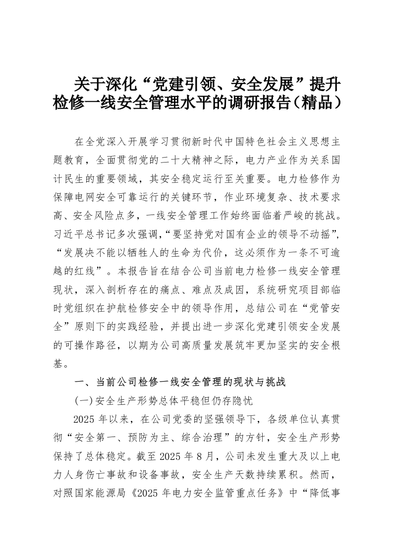 关于深化“党建引领、安全发展”提升检修一线安全管理水平的调研报告(精品)