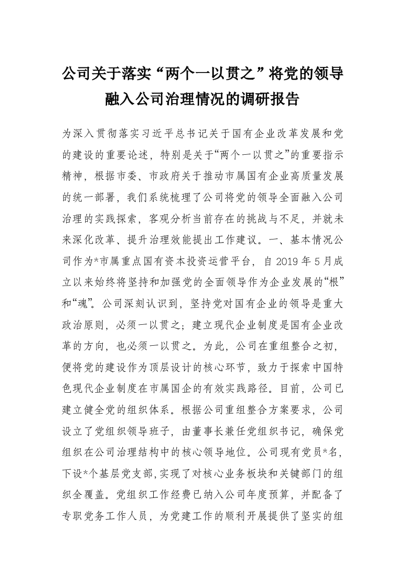 公司关于落实“两个一以贯之”将党的领导融入公司治理情况的调研报告