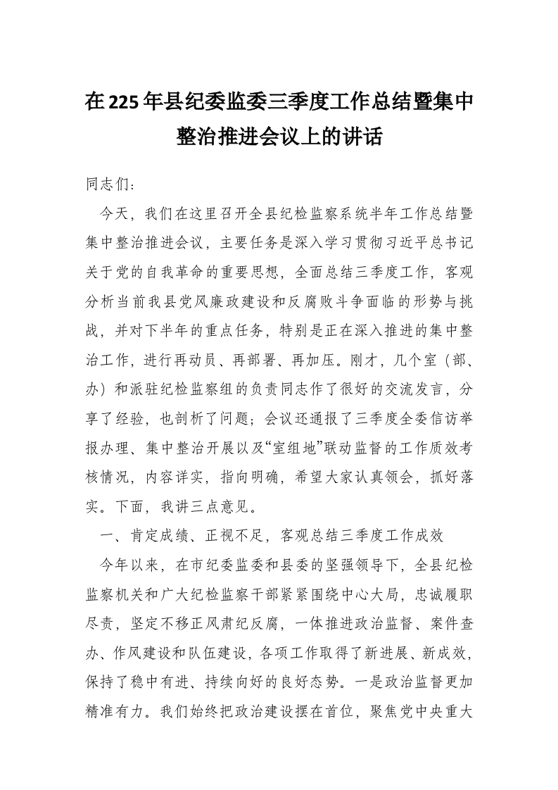 在225年县纪委监委三季度工作总结暨集中整治推进会议上的讲话