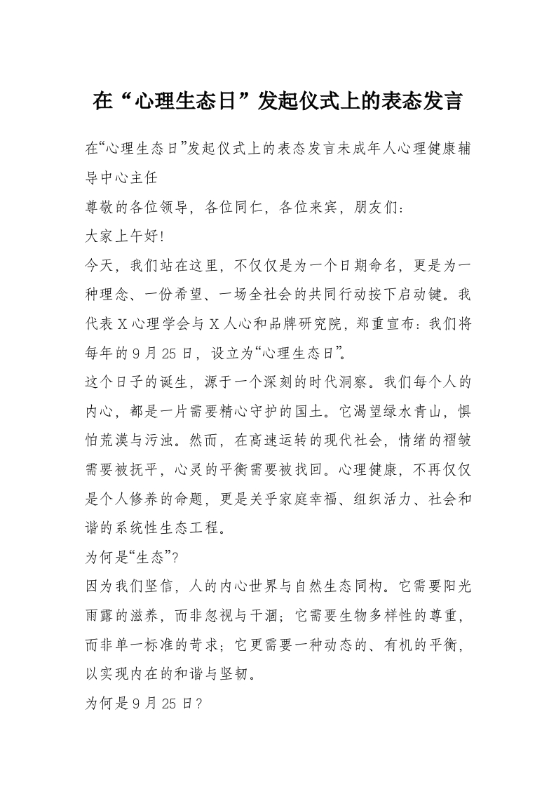 在“心理生态日”发起仪式上的表态发言