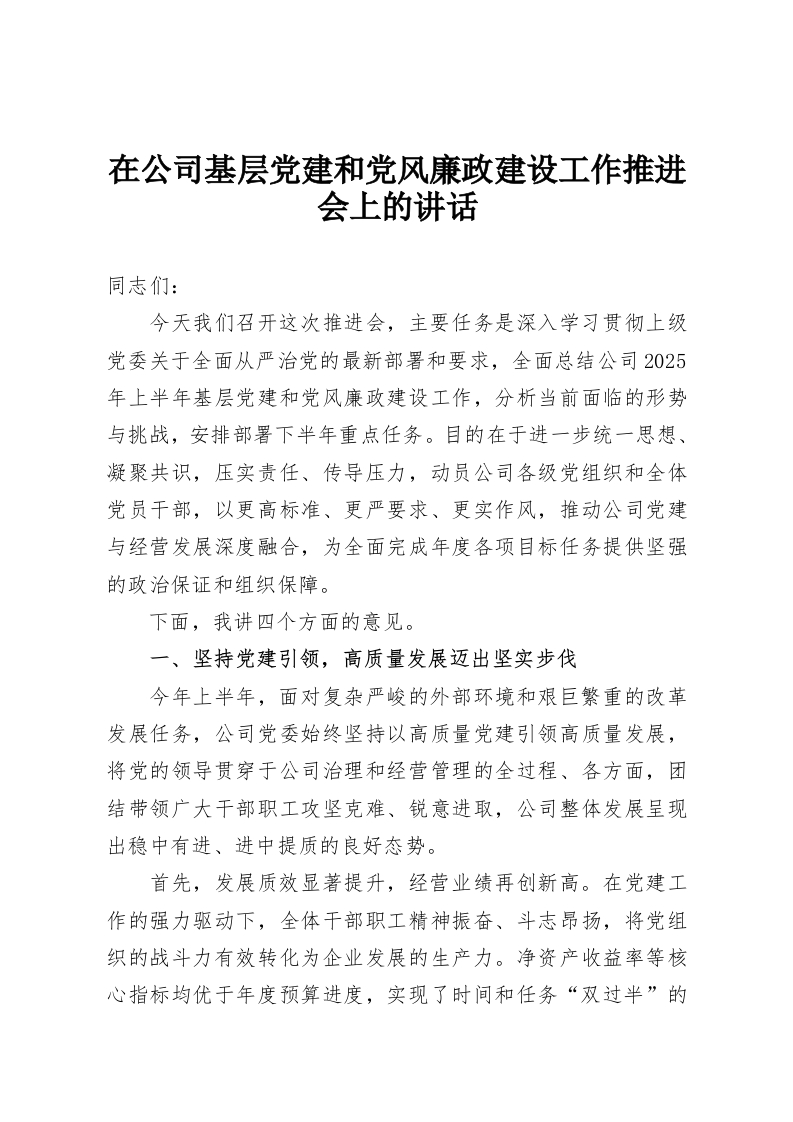 在公司基层党建和党风廉政建设工作推进会上的讲话