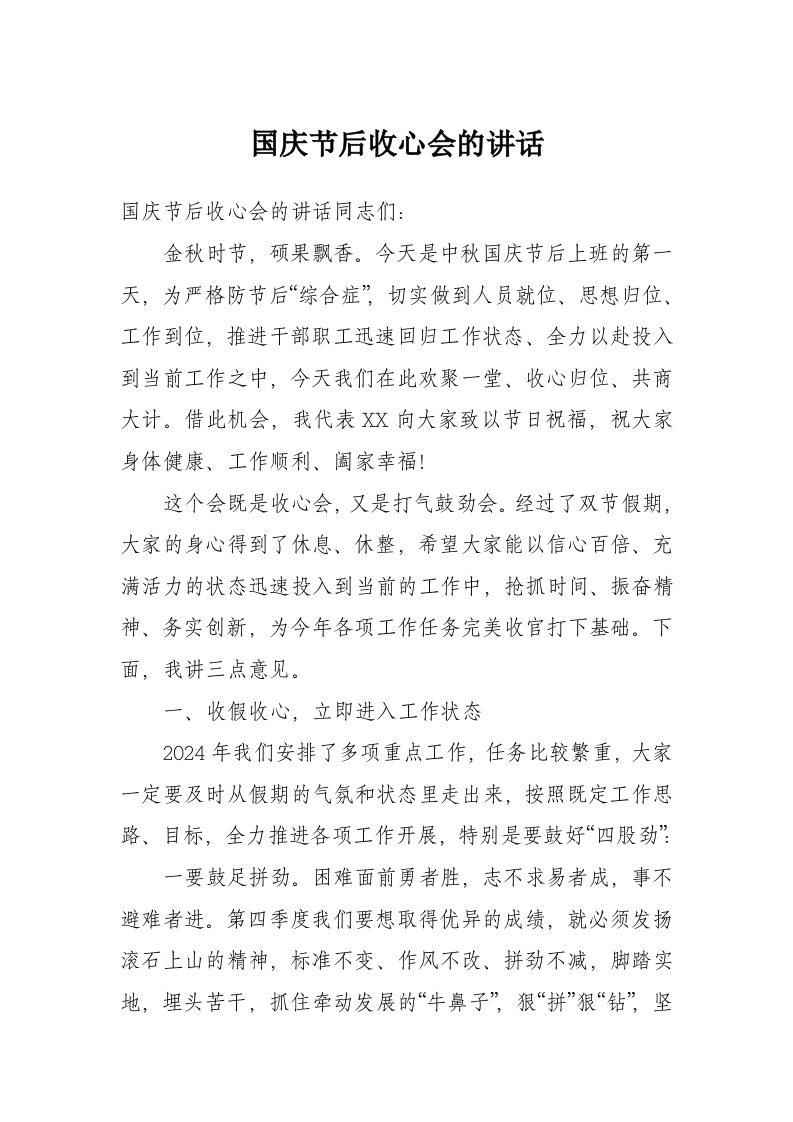 国庆节后收心会的讲话