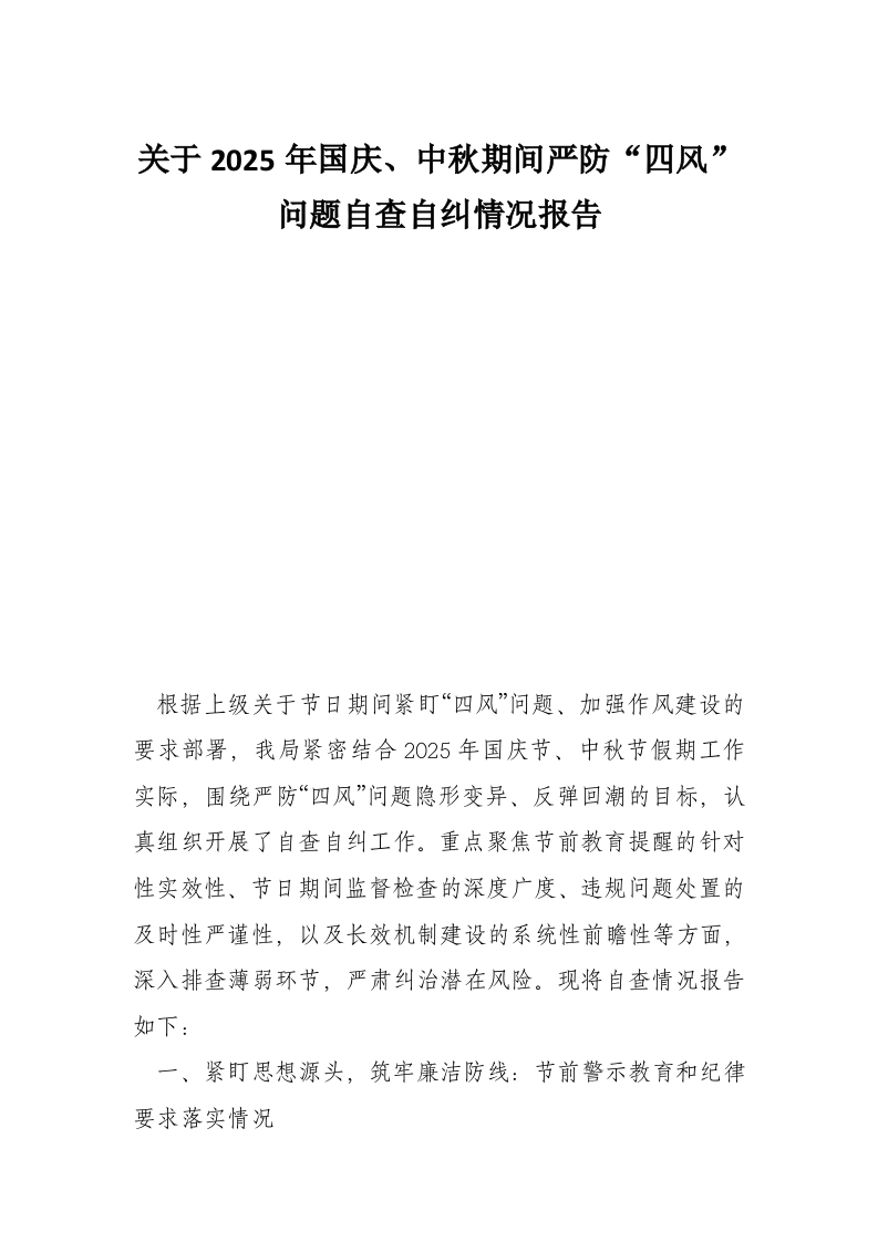 关于2025年国庆、中秋期间严防“四风”问题自查自纠情况报告
