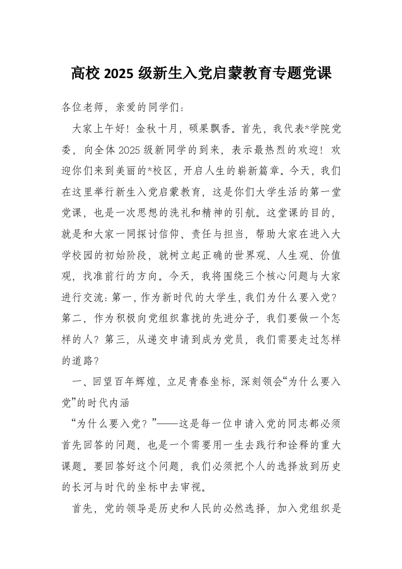 高校2025级新生入党启蒙教育专题党课