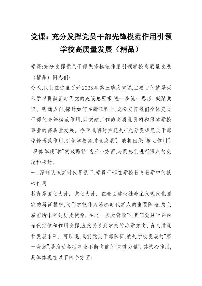 党课:充分发挥党员干部先锋模范作用引领学校高质量发展(精品)