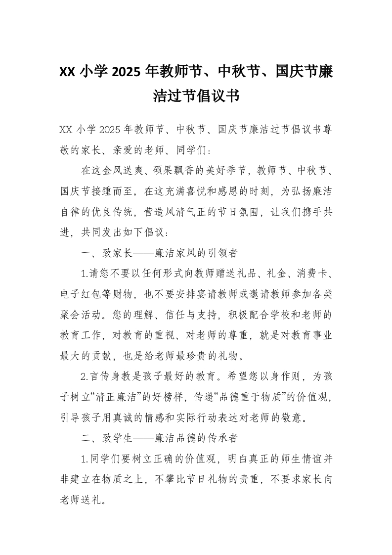 XX小学2025年教师节、中秋节、国庆节廉洁过节倡议书