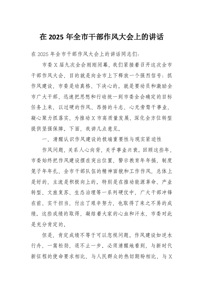 在2025年全市干部作风大会上的讲话