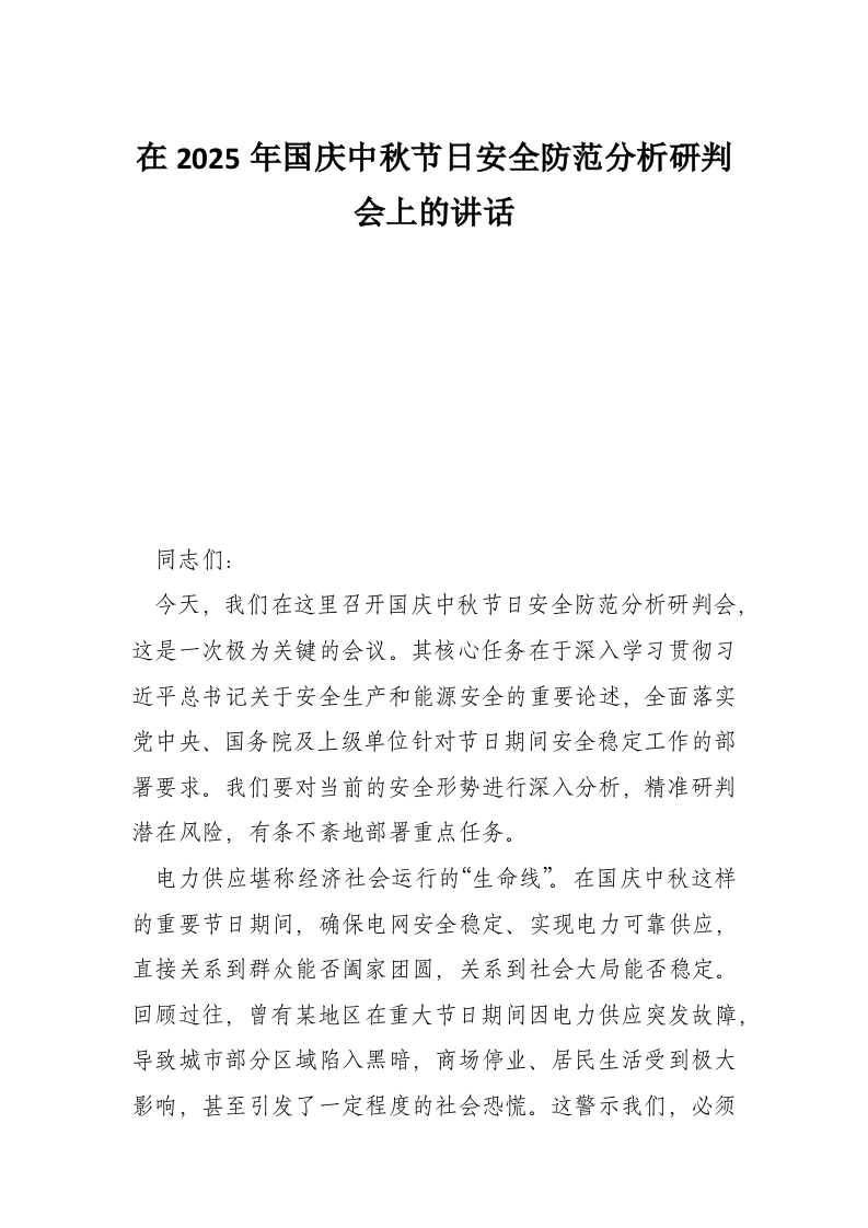 在2025年国庆中秋节日安全防范分析研判会上的讲话