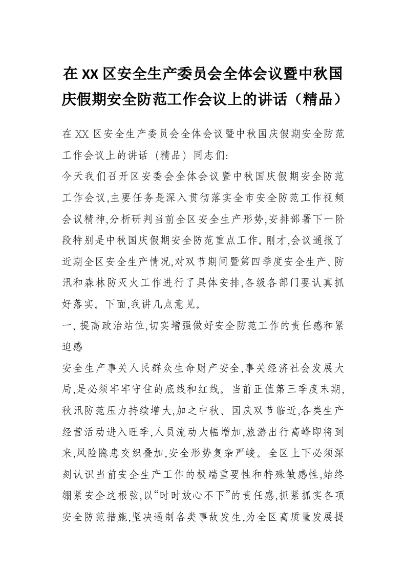 在XX区安全生产委员会全体会议暨中秋国庆假期安全防范工作会议上的讲话(精品)