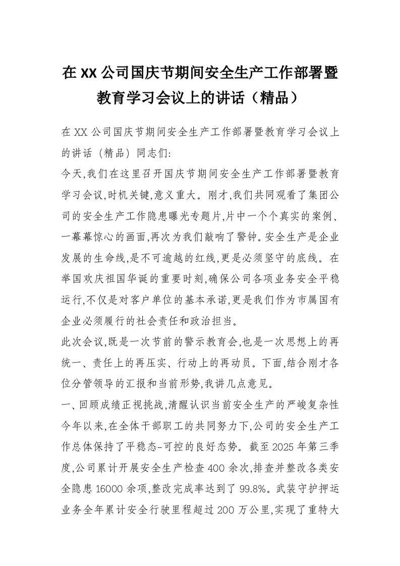 首页精选范文在XX公司国庆节期间安全生产工作部署暨教育学习会议上的讲话(精品)
